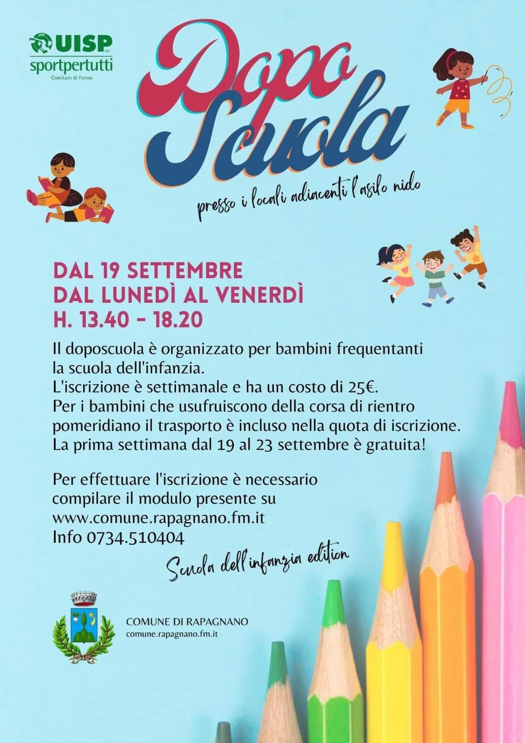 Il Comune di Rapagnano organizza il Dopo Scuola per i bambini della Scuola dell'Infanzia, a partire dal 19 settembre, presso i locali adiacenti l'Asilo Nido.