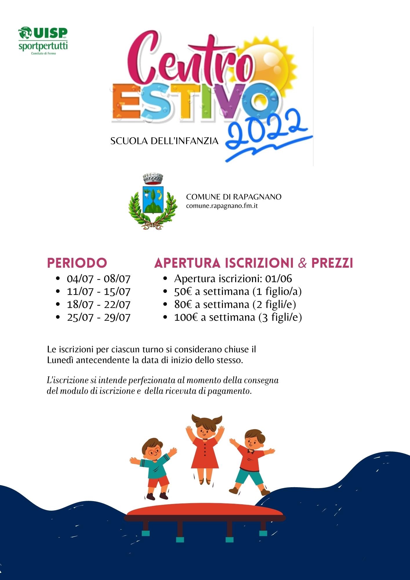Il Comune di Rapagnano, in collaborazione con alcune associazioni del territorio, organizza centri estivi e colonie marine per l'estate 2022 con l'obiettivo di riportare svago e allegria a tutti, dai bambini agli anziani.