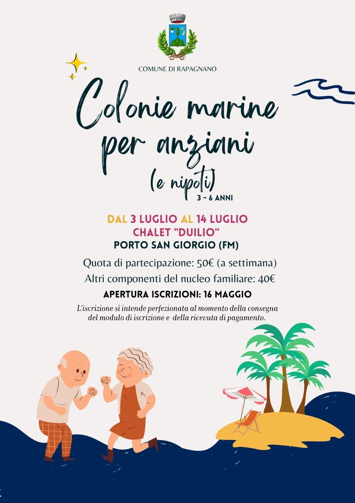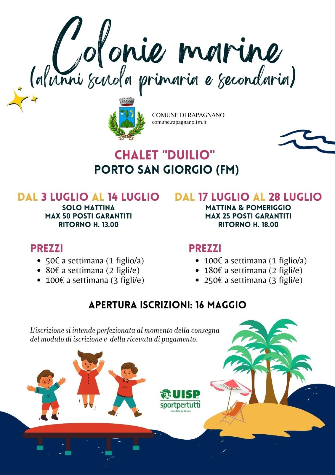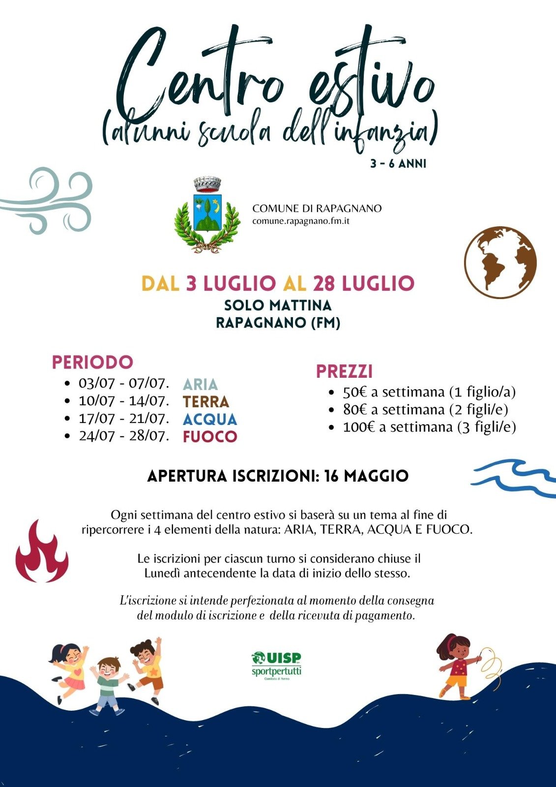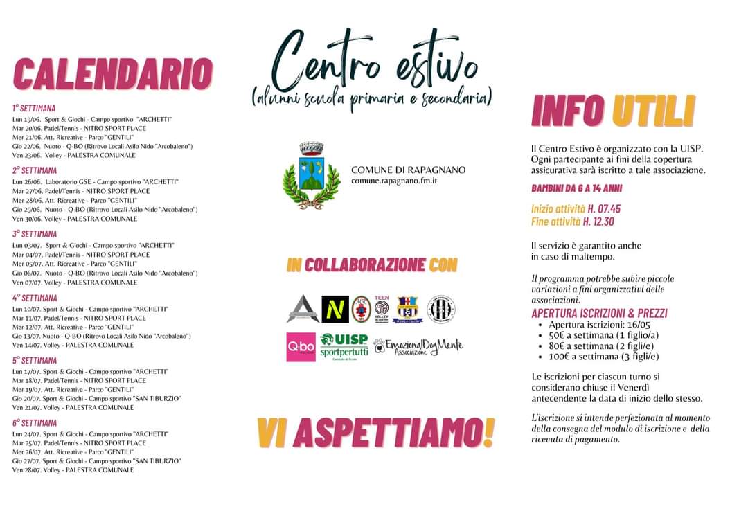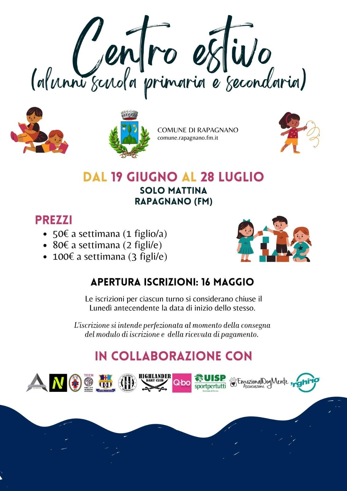 Il Comune di Rapagnano, in collaborazione con le associazioni sportive del territorio e l'UISP, organizza i centri estivi e le colonie marine per l'estate 2023 con l'obiettivo di offrire un'esperienza stimolante e portare allegria e divertimento a tutti, bambini e anziani.